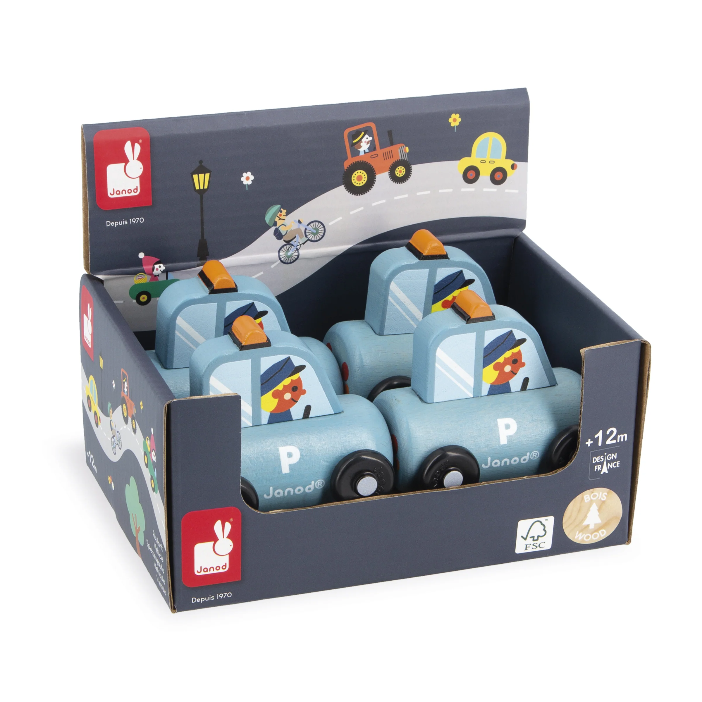 Combinado con tu alfombra y la bonita caja de cubos de la gama Janod, este juguete con ruedas completa a la perfección tu universo.