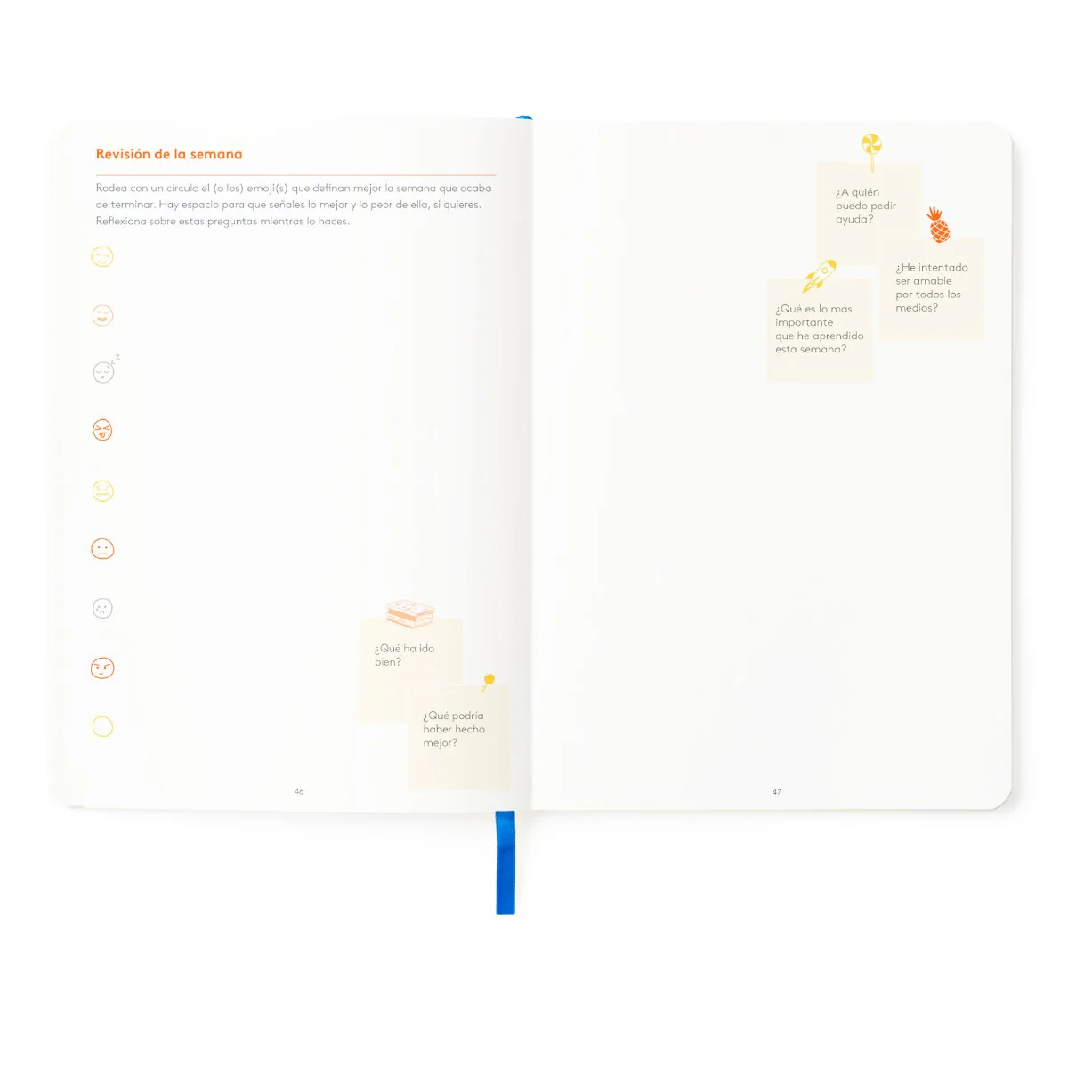 - A diferencia de «Mi Primer Diario» y «Junior», además de paginas diarias, introduce una estructura semanal para hacer reflexiones más amplias, así como suaves estímulos para probar diferentes hábitos positivos (como tener suficiente horas de sueño, hacer ejercicio, practicar la atención plena, etc.)