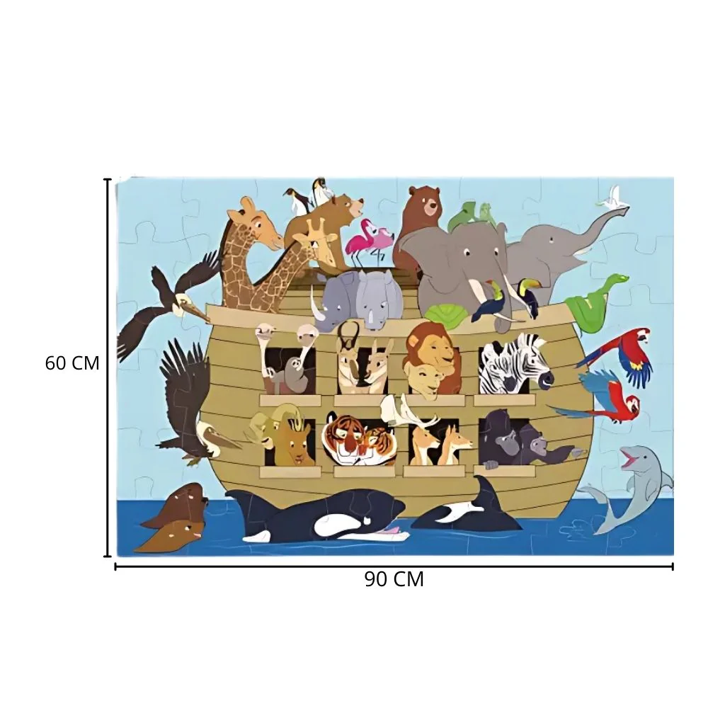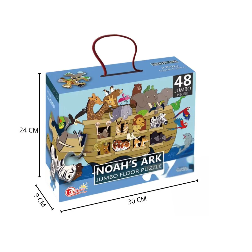 ¡A zarpar en una aventura llena de animales! El Rompecabezas Jumbo Arca de Noé 48 Piezas propone armar una gran escena en el mar, con jirafas, elefantes, leones, cebras, aves y más subiendo al arca. Sus piezas grandes, resistentes y de bordes suaves son ideales para el suelo y para manos pequeñas desde los 3 años. Un juego seguro que estimula la concentración y el lenguaje mientras disfrutan en familia de un diseño atractivo y colorido.