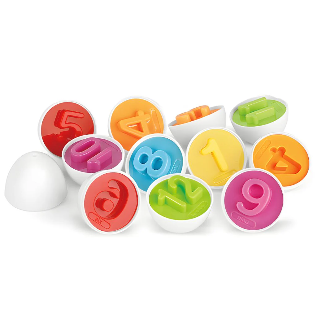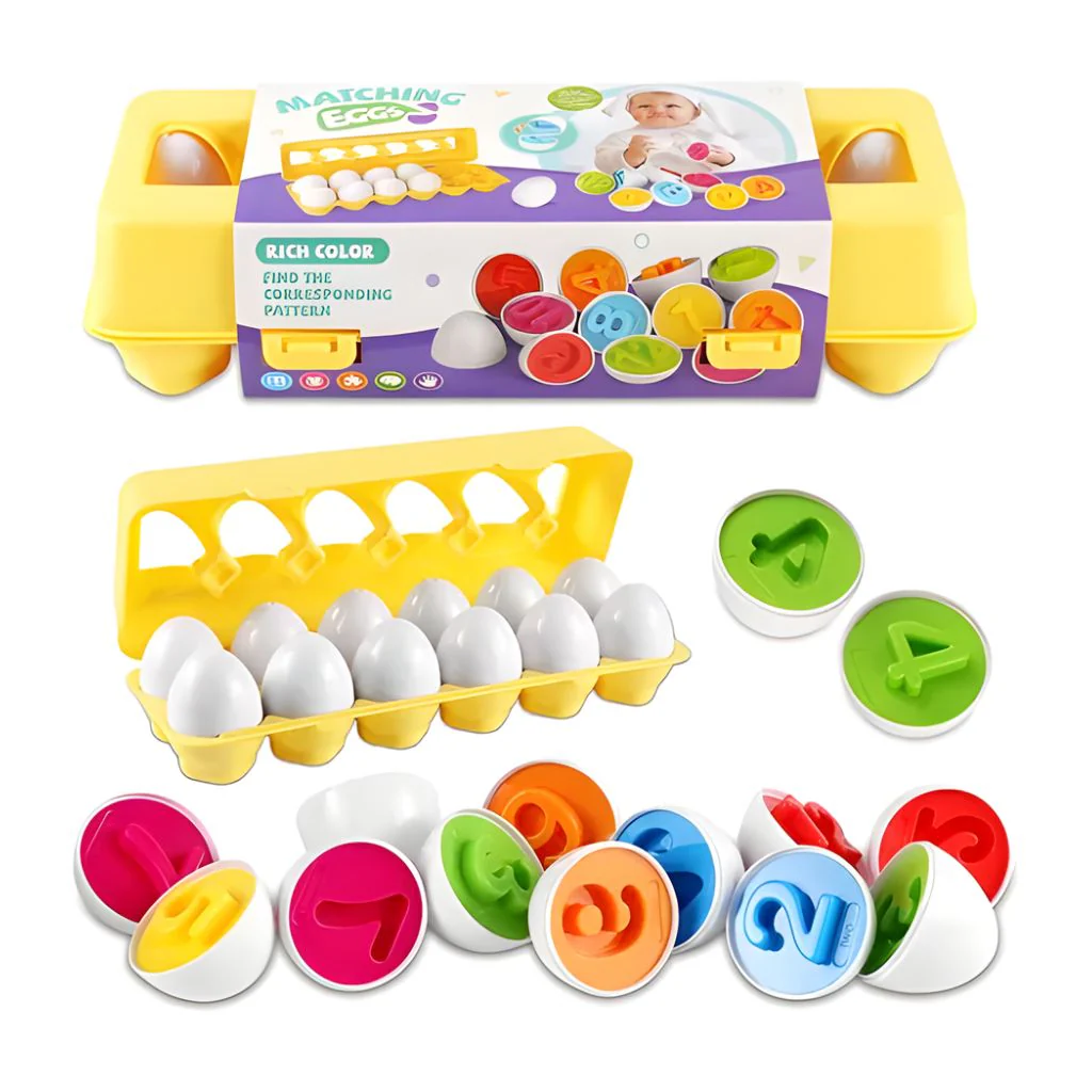Abre los huevitos, busca la mitad que encaje y forma el número correcto. Propón ordenar del 1 al 12, clasificar por color, hacer pequeñas sumas/restas con grupos de huevos o jugar libremente. Recomendado para interior; ideal para salas cuna, preescolar y como regalo educativo.