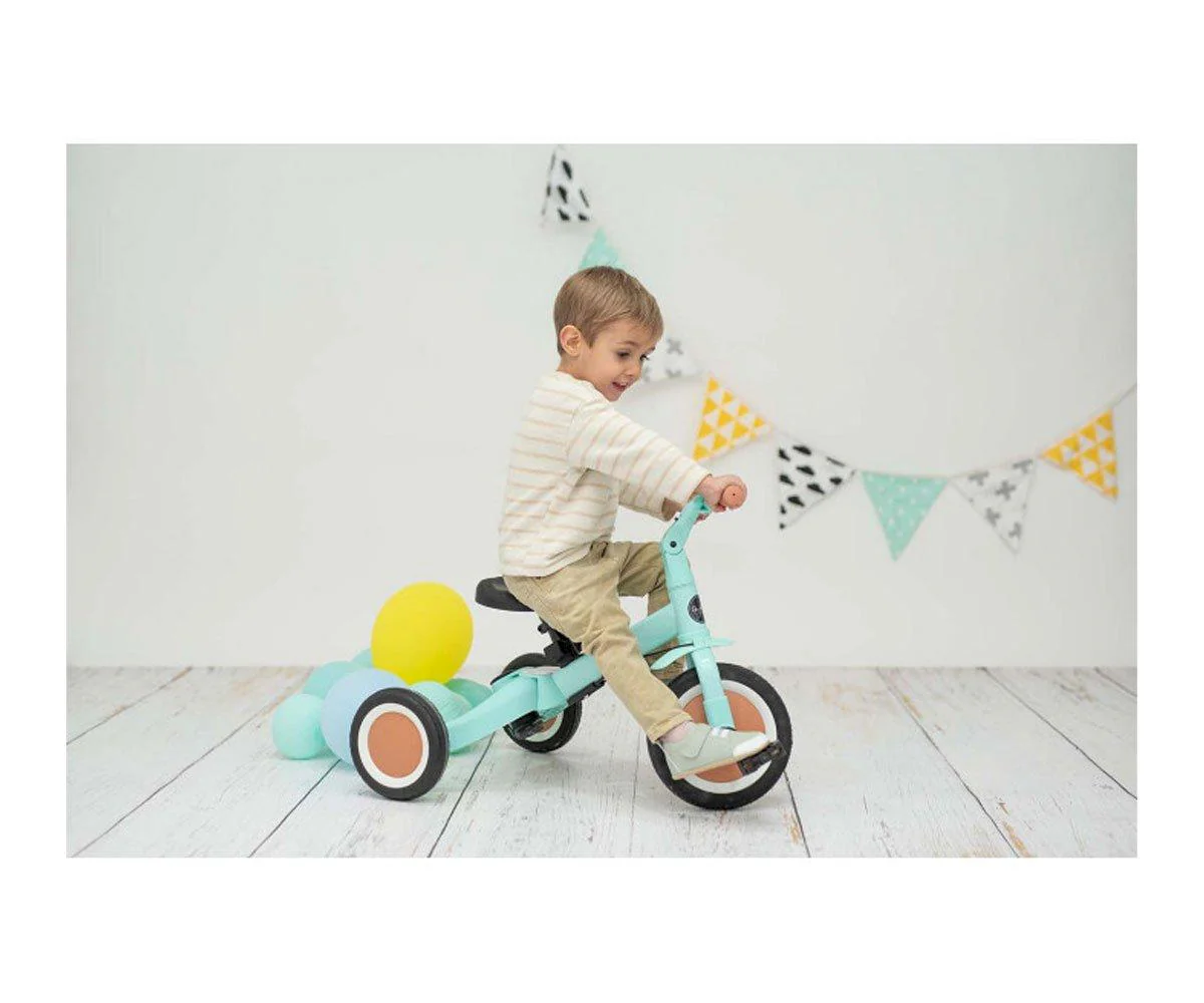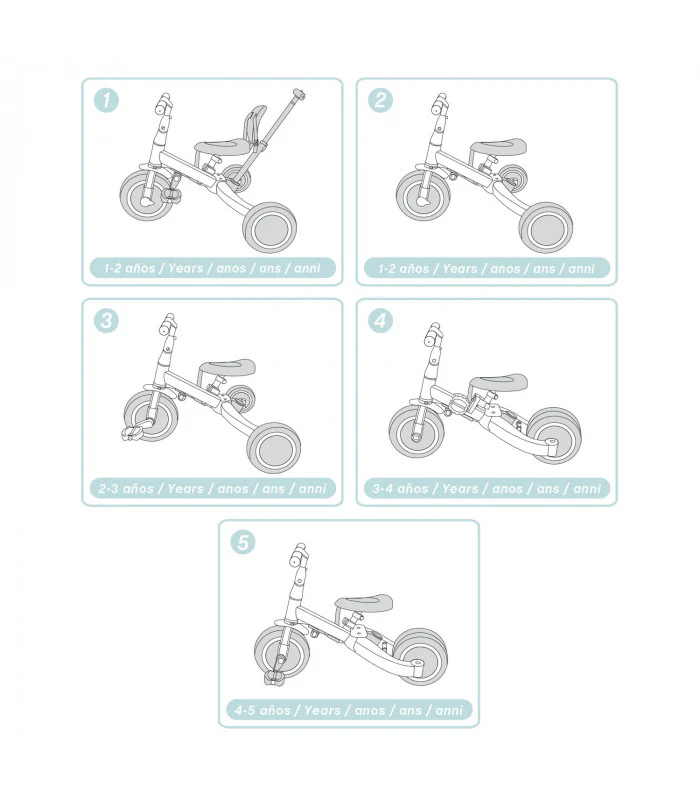 Este triciclo se irá transformando y adaptando a medida que el niño o niña crece. De triciclo a bicicleta con o sin pedales, pasando por todos los modelos necesarios para la adaptación del niño.